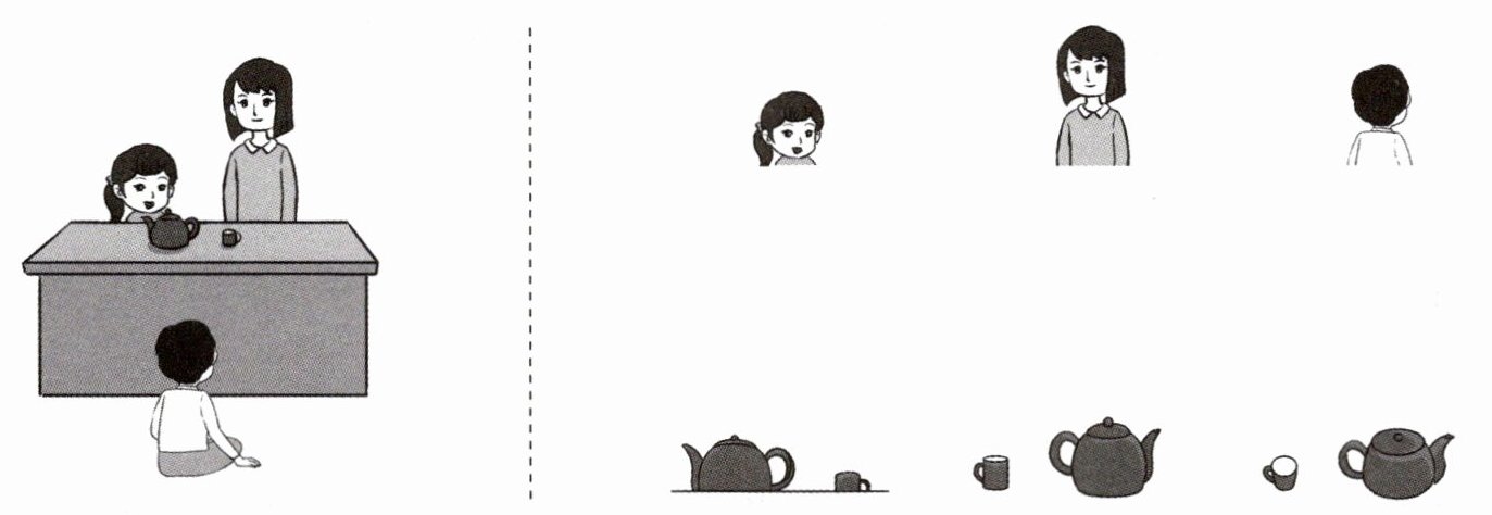 2. 下面右边的三幅图分别是谁看到的?想一想,连一连。