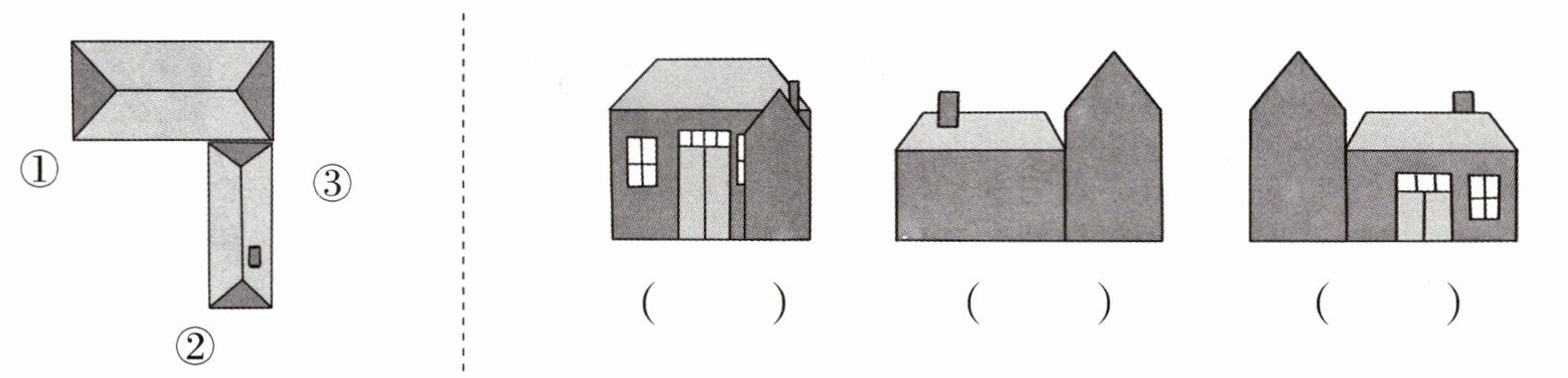 3. 左图是在空中看到的小丽的家,右边的三幅图分别是站在①②③号哪个位置看到的?填上对应的序号。