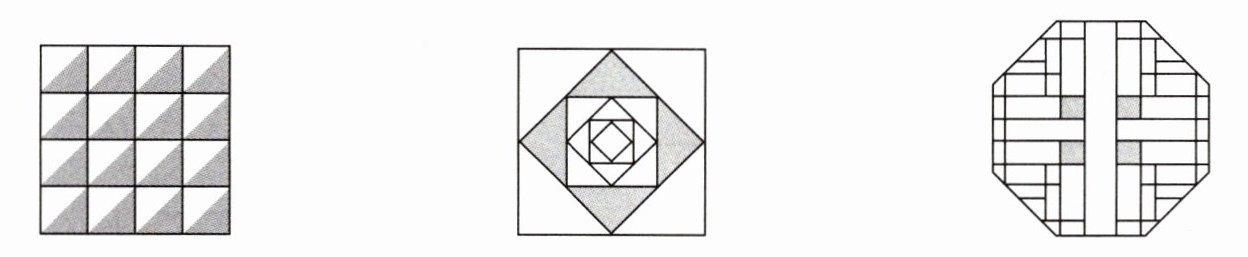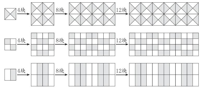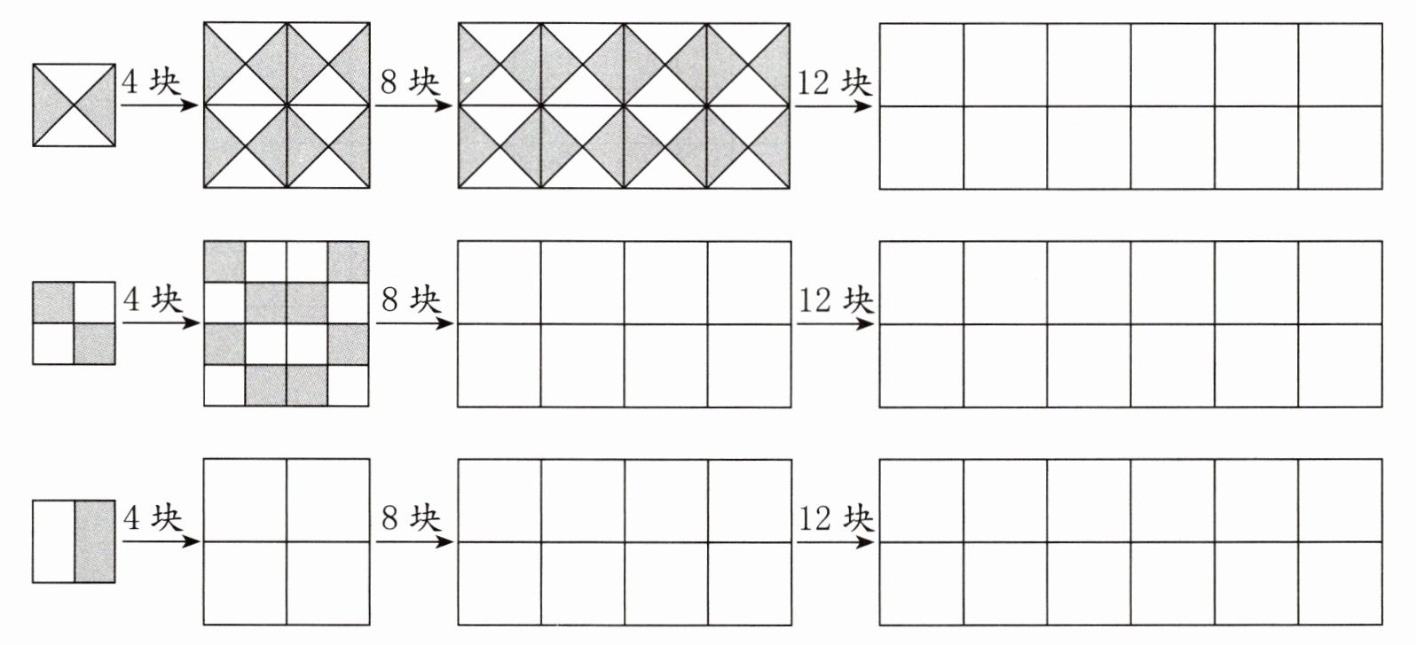 2. 小贝家装修房子要铺地砖,有三种地砖,小贝尝试画一画表示出地砖拼起来的样子,请你帮助小贝继续画一画。