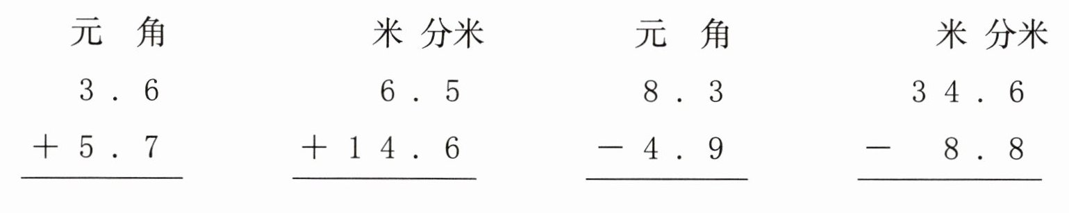 |$\begin{array}{r}3.6\\+5.7\\\hline\end{array}\\\hline $|$\begin{array}{r}6.5\\+14.6\\\hline\end{array}\\\hline $|$\begin{array}{r}8.3\\-4.9\\\hline\end{array}\\\hline $|$\begin{array}{r}34.6\\-8.8\\\hline\end{array}\\\hline $|