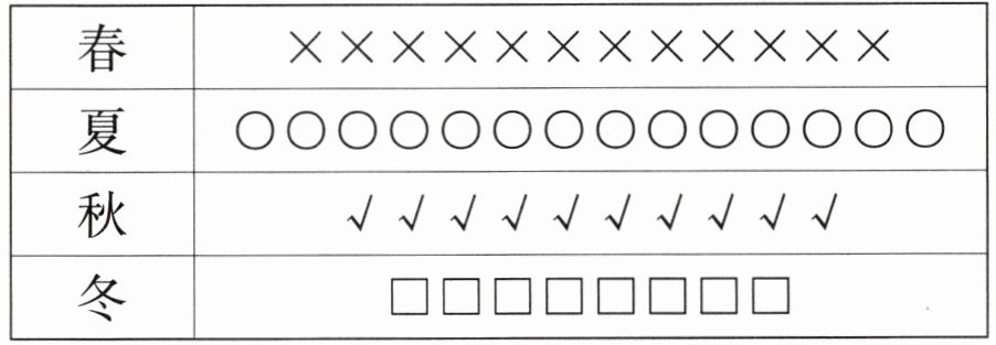 2. 下面是丽丽调查三(1)班全班同学最喜欢的季节的情况。(1个符号表示1人)