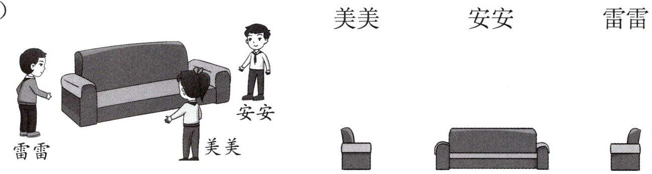 (2) 雷雷连第三幅图中的第三个沙发图示,美美连第三幅图中的第二个沙发图示,安安连第三幅图中的第一个沙发图示。