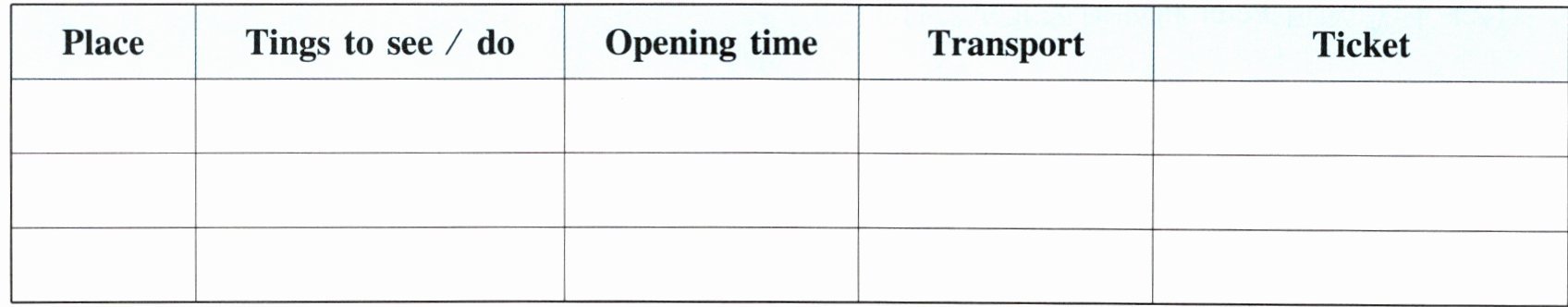 | Place | Things to see / do | Opening time | Transport | Ticket |