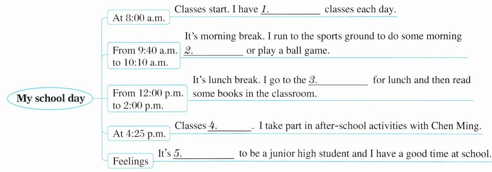 1. seven / 7 2. exercise 3. canteen 4. end 5. exciting