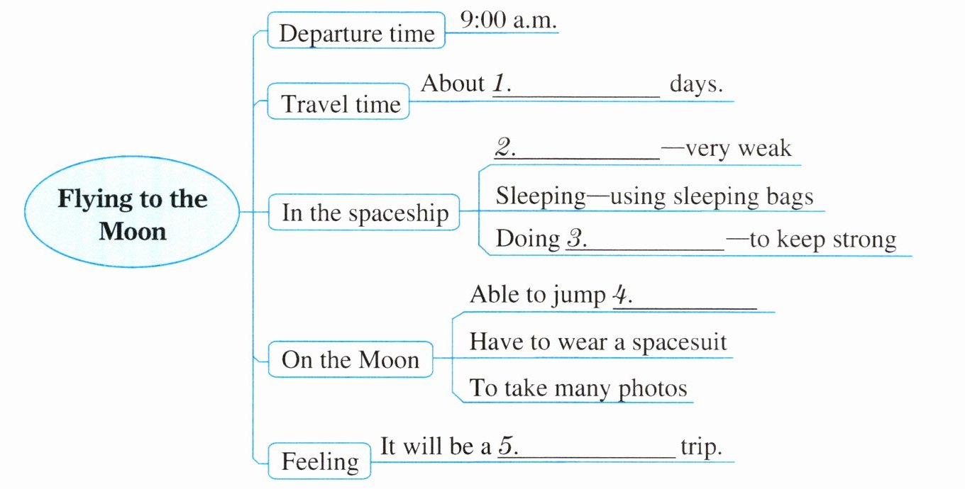 (weigh) much less on the Moon, so he can jump very high. Li Jun will have to wear a spacesuit to help him 9. breathe