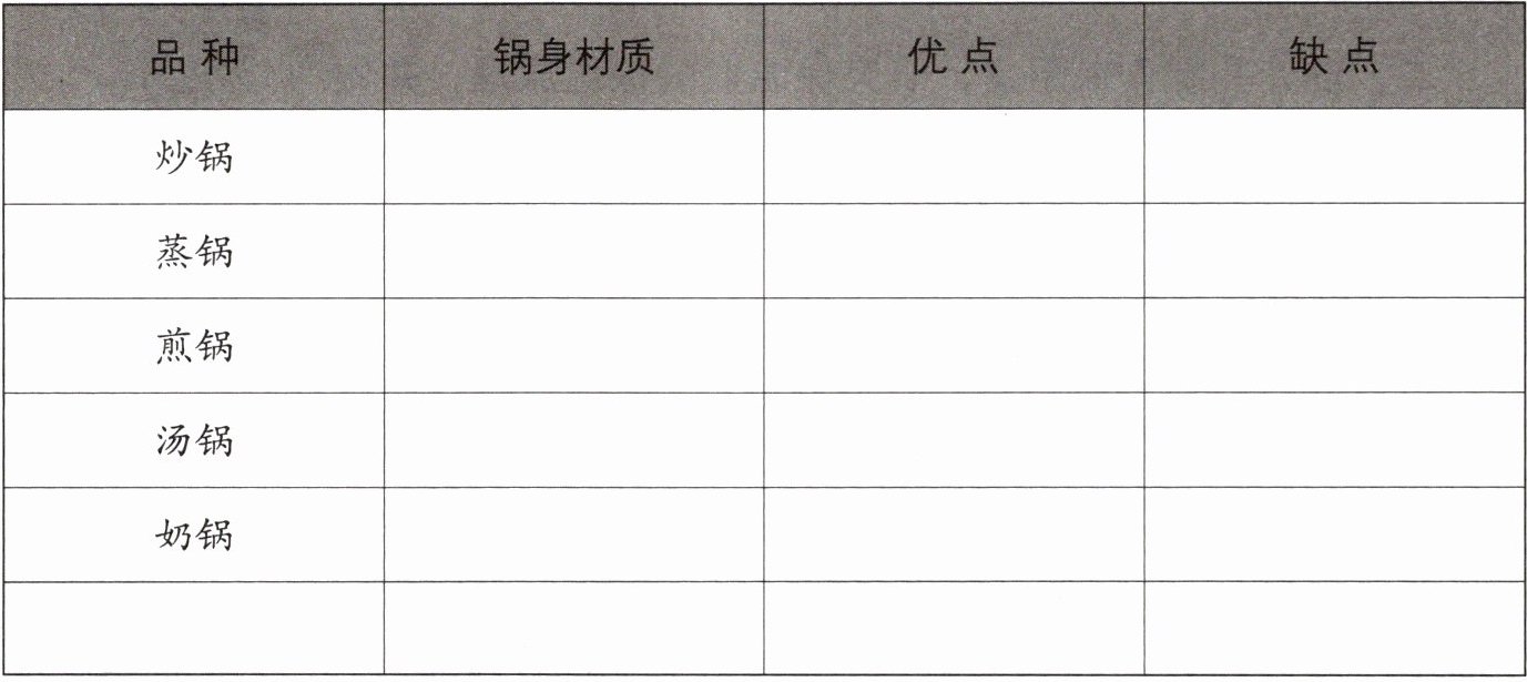 锅在烹饪中起着非常重要的作用。不要以为我们只是利用锅的传热性能来加热食物,盘点一下你家的锅:炒锅、蒸锅、煎锅、汤锅、奶锅……不仅功能不同,材质、款式也各不相同。邀请家长,一起来对常用锅具做一番调查研究吧!