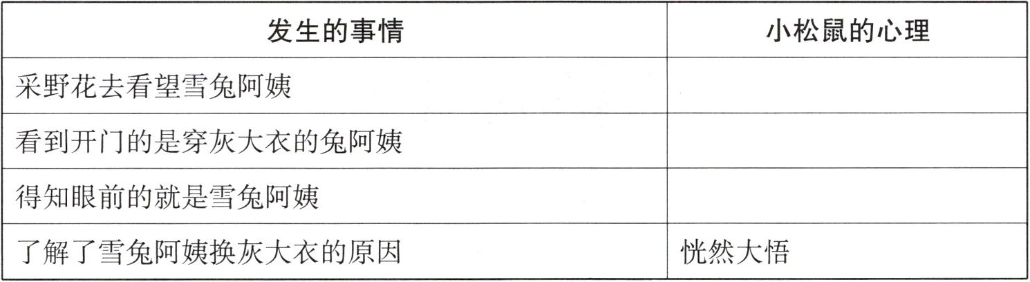 春天来了,小松鼠去看望雪兔阿姨时,他的心理发生了一系列变化。读一读文章的第 5~12 自然段,你能写一写小松鼠的心理变化过程吗?