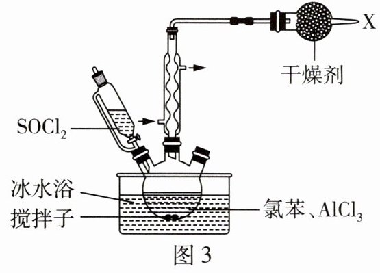 (3) 氯苯试剂可能含有水,为防止氯苯中的水与$\mathrm{SOCl}_{2}$发生反应,在使用前应作除水处理,A 项正确;$\mathrm{AlCl}_{3}$是该反应的催化剂且易升华,故应将三颈烧瓶置于冰水浴中来控制反应温度,B 项正确;虽然实验在通风橱内进行,但有毒气体不可随意排放到空气中,故$\mathrm{X}$处需连接尾气吸收装置,C 项错误;由于氯苯与$\mathrm{SOCl}_{2}$在$\mathrm{AlCl}_{3}$催化下发生反应时生成$\mathrm{HCl}$气体,故当反应体系中不再产生气泡时,可判定反应基本结束,D 项正确。