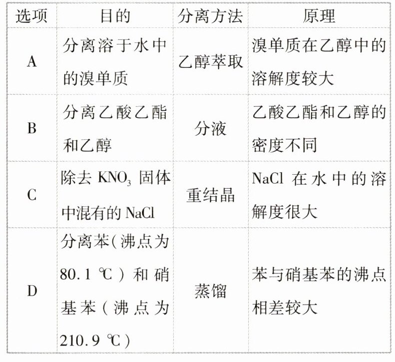 C:二者溶解度受温度影响不同,选择重结晶法分离,原理描述错误,C错误;