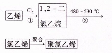 (3) 乙烯($CH_2=CH_2$)转化成 1,2 - 二氯乙烷($CH_2ClCH_2Cl$)的反应属于加成反应,则化学方程式为 $CH_2=CH_2 + Cl_2 \longrightarrow CH_2ClCH_2Cl$,1,2 - 二氯乙烷转化成氯乙烯($CH_2=CHCl$)的反应属于卤代烃的消去反应。