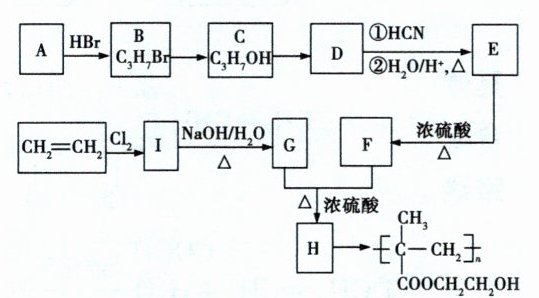 ;E在浓硫酸、加热条件下发生消去反应得到F[$\mathrm{CH_2=C(CH_3)COOH}$]。乙烯($\mathrm{CH_2=CH_2}$)与$\mathrm{Cl_2}$发生加成反应得到I($\mathrm{CH_2ClCH_2Cl}$);I与$\mathrm{NaOH}$的水溶液共热发生取代反应得到G($\mathrm{CH_2OHCH_2OH}$)。F[$\mathrm{CH_2=C(CH_3)COOH}$]与G($\mathrm{CH_2OHCH_2OH}$)发生酯化反应得到H(