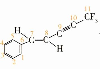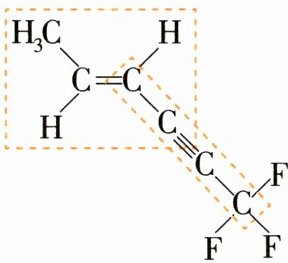 解析 碳碳双键和苯环都是平面形结构,而碳碳三键是直线形结构,因此所有的碳原子( 共 11 个) 和氢原子( 共 7 个) 有可能在同一平面上,而 3 个氟原子中最多有 1 个氟原子在这个平面上,则共平面的原子最多有 19 个,共直线的碳原子最多有 4 个,A、C、D 项正确;共平面的碳原子至少有 7 个,