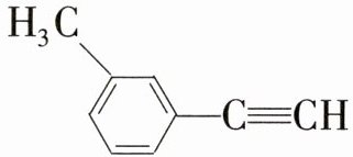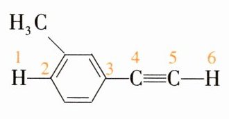 解析▶该分子中甲基上的碳原子采取$sp^3$杂化、苯环上的碳原子采取$sp^2$杂化,碳碳三键上的碳原子采取$sp$杂化,A项正确;该分子中有17个原子,共面原子数最多时,分子中甲基上的两个氢原子不在该平面内,即最多有15个原子共平面,B项错误;苯环中的碳碳键是一种介于碳碳单键和碳碳双键之间的独特的化学键,C项错误;为了便于说明,对分子中部分原子编号如下: