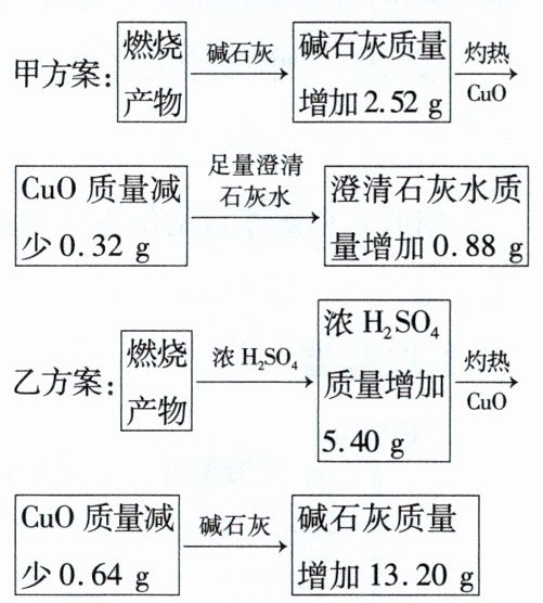 (1)甲方案中碱石灰增加的质量为$CO_2$和$H_2O$的质量之和,根据$CuO$减少的质量或澄清石灰水增加的质量,可求出烃A不完全燃烧生成$CO$的质量,但不能求出生成的$CO_2$及$H_2O$的质量,故无法确定烃A的最简式;乙方案中浓$H_2SO_4$增加的质量为$H_2O$的质量,碱石灰增加的质量为$CO_2$(包括烃A燃烧生成的$CO_2$和$CO$与$CuO$反应生成的$CO_2$)的质量,根据原子守恒,结合题图数据可求出烃A中$C、H$的个数比,即得最简式。