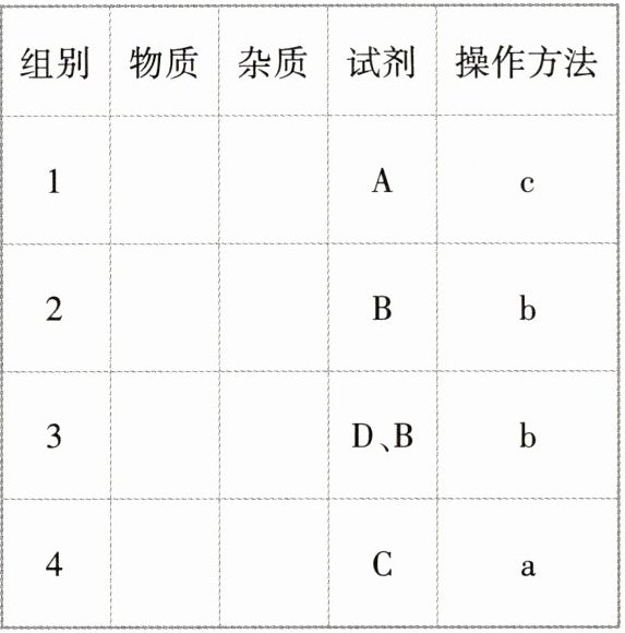 *例13 除去下列物质中含有的少量杂质,请选择所给的合适试剂和操作方法填入下表中(填字母)。
