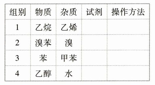 解析▶ 乙烷中混有少量乙烯,应通过溴水除去,不能用酸性$KMnO_4$溶液,因为酸性$KMnO_4$溶液与乙烯反应生成$CO_2$,会引入新的杂质;乙烯和乙烷都是气体,故应用洗气装置。溴苯不与$NaOH$溶液反应,溴能与$NaOH$溶液反应,故溴苯中混有少量溴,可加入$NaOH$溶液,液体分层,通过分液进行分离。苯中混有少量甲苯,加入酸性$KMnO_4$溶液,甲苯被氧化为苯甲酸,再加入$NaOH$溶液,苯甲酸转化为苯甲酸钠进入水层,通过分液进行分离。乙醇中混有少量水,加入$CaO$,$CaO$与水反应生成$Ca(OH)_2$,再通过蒸馏进行分离。