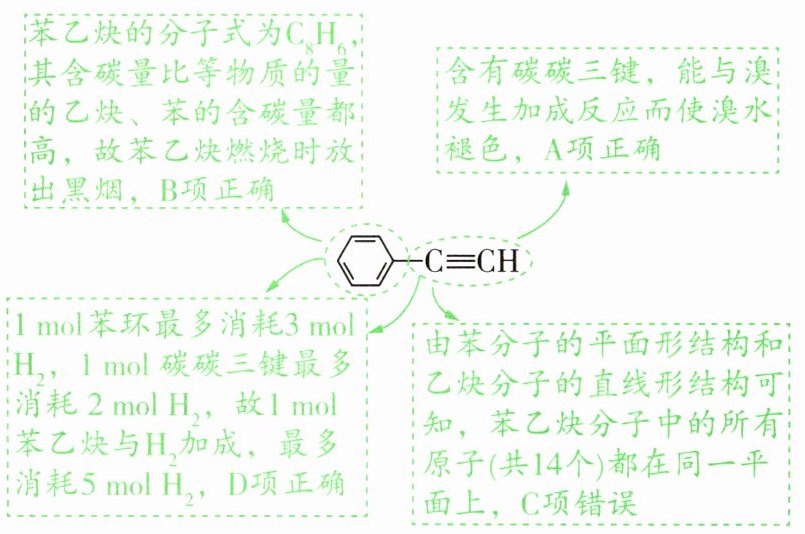 D.1 mol 苯乙炔与$\mathrm{H_2}$加成,最多消耗 5 mol$\mathrm{H_2}$