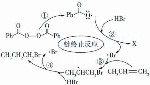 解析 ▶ 过程②中,根据原子守恒可推知X为$PhCOOOH$,A项正确;过程③中还可能生成$CH_3CHBrCH_2$,有副产物存在,B项错误;自由基之间可以互相结合形成稳定的化合物分子,反应即告终止,该反应体系中存在$· Br、CH_3CHCH_2Br$等,故上述链终止反应中存在$· Br+· Br\longrightarrow Br_2$,C项正确;由题图可知,过程④可表示为$CH_3CHCH_2Br+HBr\longrightarrow· Br+CH_3CH_2CH_2Br$,D项正确。