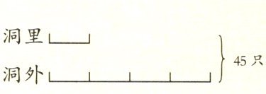 3. 根据“洞里有9只跑到洞外后,洞外的只数正好是洞里的4倍”,可以把现在洞里的只数看作1倍,此时洞外的只数就相当于这个数的4倍,那么,总只数45只对应的就是(4+1)倍,则