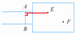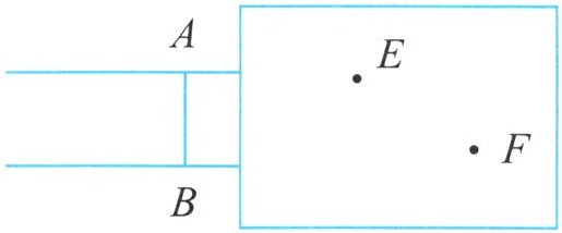 3. 下图是小华跳远后的示意图。 $ AB $ 是起跳线, $ E $ 是左脚的落点, $ F $ 是右脚的落点。如果用尺子量小华跳远的成绩(离起跳线最近的一点为计算成绩的点),那么尺子该怎样放?请画出示意图。