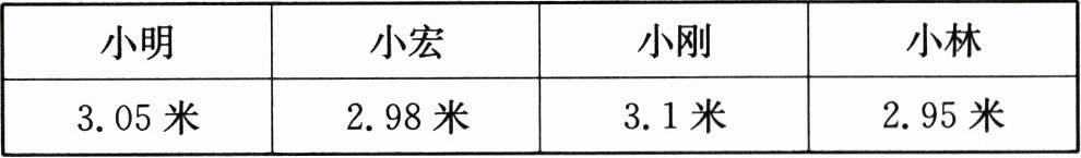1. 3.1米>3.05米>2.98米>2.95米 第1名:小刚,第2名:小明,第3名:小宏