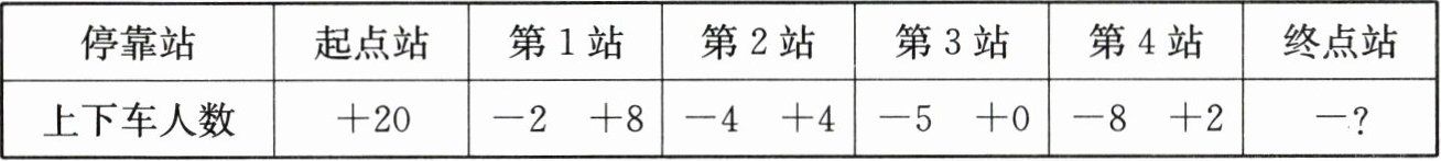 1. 如表记录了一辆公交汽车从起点站开出后,途中经过 4 个停靠站,最后到达终点站的乘客变化情况。请根据表格数据回答问题。
