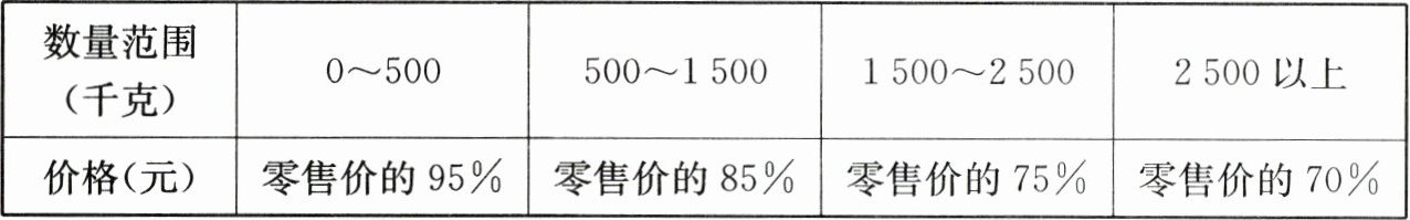 $A$家规定:批发数量不超过1000千克,按零售价的92%优惠;批发数量不超过2000千克,按零售价的90%优惠;超过2000千克的按零售价的88%优惠.