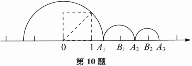 10. 如图,通过画边长为 $1$ 的正方形,就能准确的把 $\sqrt{2}$ 表示在数轴上点 $A_1$ 处,记 $A_1$ 右侧最近的整数点为 $B_1$,以点 $B_1$ 为圆心,$A_1B_1$ 为半径画半圆,交数轴于点 $A_2$,记 $A_2$ 右侧最近的整数点为 $B_2$,以点 $B_2$ 为圆心,$A_2B_2$ 为半径画半圆,交数轴于点 $A_3$,如此继续,则 $A_8B_8$ 的长为