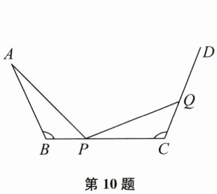 10. 如图,$AB = 4\mathrm{cm}$,$BC = 6\mathrm{cm}$,$\angle B = \angle C$,如果点$P$在线段$BC$上以$2\mathrm{cm}/\mathrm{s}$的速度由$B$点向$C$点运动,同时,点$Q$从$C$点出发沿射线$CD$运动. 若经过$t\mathrm{s}$后,$\triangle ABP$与$\triangle CQP$全等,则$t$的值是