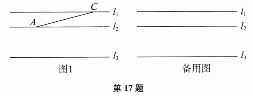 17. (本题12分)如图1,已知直线l₁//l₂//l₃,且l₁和l₂之间的距离为1,l₂和l₃之间的距离为2,点A、C分别在直线l₂和l₁上.