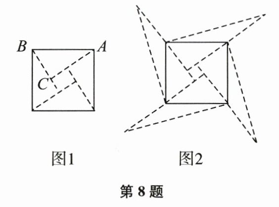 8. 图1是我国古代著名的"赵爽弦图"的示意图,它是由四个全等的直角三角形围成的.若$AC = 6,BC = 5$,将四个直角三角形中的边长为6的直角边分别向外延长一倍,得到图2所示的"数学风车",则这个风车的外围周长是