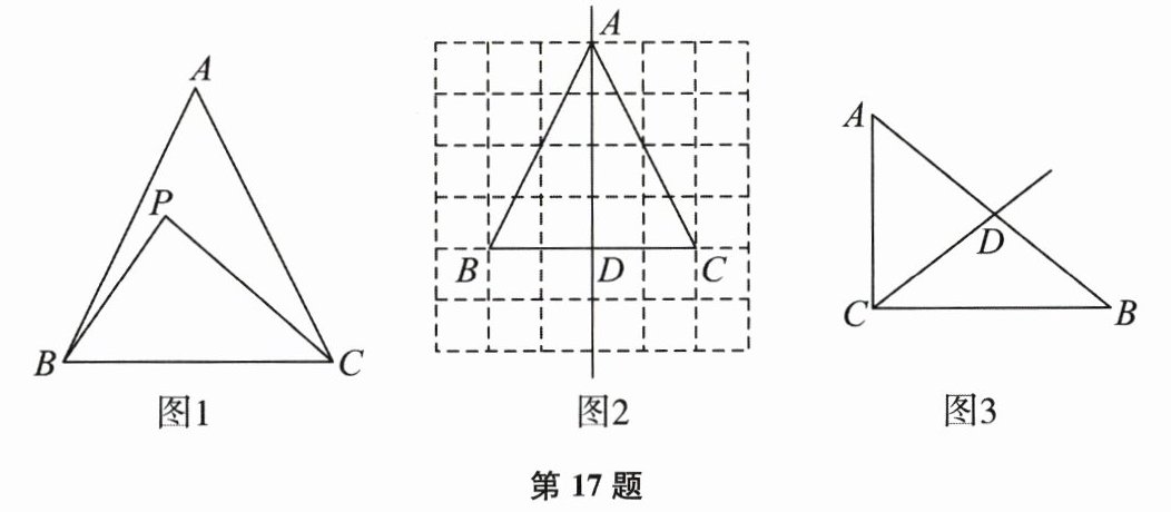 (2) 如图2,等腰$\triangle ABC$的顶点都在格点上,点D是BC的中点,点P在直线AD上,请在图中标出使得点P是$\triangle ABC$的勾股点时,点P的位置;