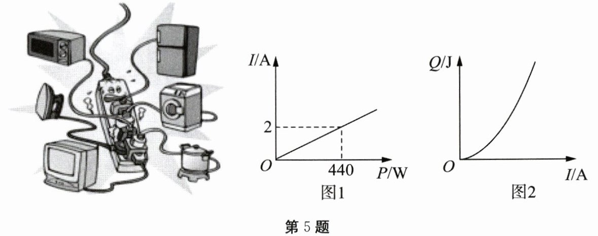 5. 把多个用电器连接在同一个插线板上,同时使用一段时间后,插线板的电源线会明显发热,存在安全隐患.数学兴趣小组对这种现象进行研究,得到时长一定时,插线板电源线中的电流$I$与使用电器的总功率$P$的函数图像(如图1),插线板电源线产生的热量$Q$与$I$的函数图像(如图2).下列结论中错误的是 (