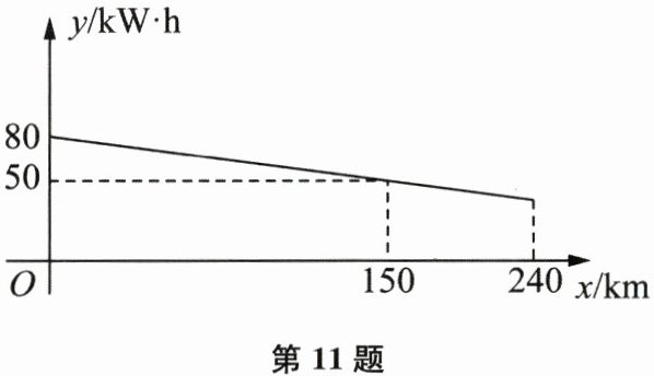11. (本题12分)我国新能源汽车快速健康发展,续航里程不断提升,王师傅驾驶一辆纯电动汽车从$A$市前往$B$市.他驾车从$A$市一高速公路入口驶入时,该车的剩余电量是$80\mathrm{kW\cdot h}$,行驶了$240\mathrm{km}$后,从$B$市一高速公路出口驶出.已知该车在高速公路上行驶的过程中,剩余电量$y(\mathrm{kW\cdot h})$与行驶路程$x(\mathrm{km})$之间的关系如图所示.