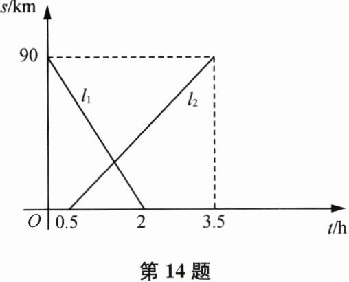 14. (本题12分)$A$、$B$两地相距$90\mathrm{km}$,甲、乙两人从两地出发相向而行,甲先出发.图中$l_{1}$,$l_{2}$表示两人离$A$地的距离$S(\mathrm{km})$与时间$t(\mathrm{h})$的关系,结合图像回答下列问题: