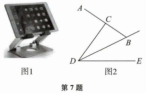 7. 如图1是一个平板电脑支架,由托板、支撑板和底座构成,平板电脑放置在托板上,图2是其侧面结构示意图.托板AB可绕点C转动,支撑板CD可绕点D转动,支撑板的顶端C恰好是托板AB的中点.现量得AB=10 cm,当CD⊥AB,且射线DB恰好是∠CDE的平分线时,点B到直线DE的距离是(