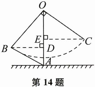 14. 小丽与爸妈在公园里荡秋千.如图,小丽坐在秋千的起始位置A处,OA与地面垂直,两脚在地面上用力一蹬,妈妈在距地面1 m高的B处接住她后用力一推,爸爸在C处接住她.若妈妈与爸爸到OA的水平距离BD、CE分别为1.4 m和1.9 m,∠BOC=90°,爸爸在C处接住小丽时,小丽距离地面的高度是