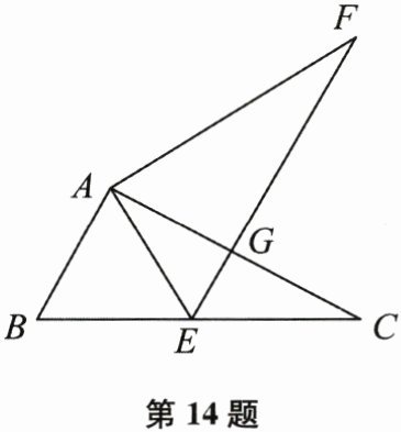14. (本题10分)如图,在 $ \triangle ABC $ 和 $ \triangle AEF $ 中,点 $ E $ 在 $ BC $ 边上, $ AE = AB $, $ AC = AF $, $ \angle CAF = \angle BAE $, $ EF $ 与 $ AC $ 交于点 $ G $.
