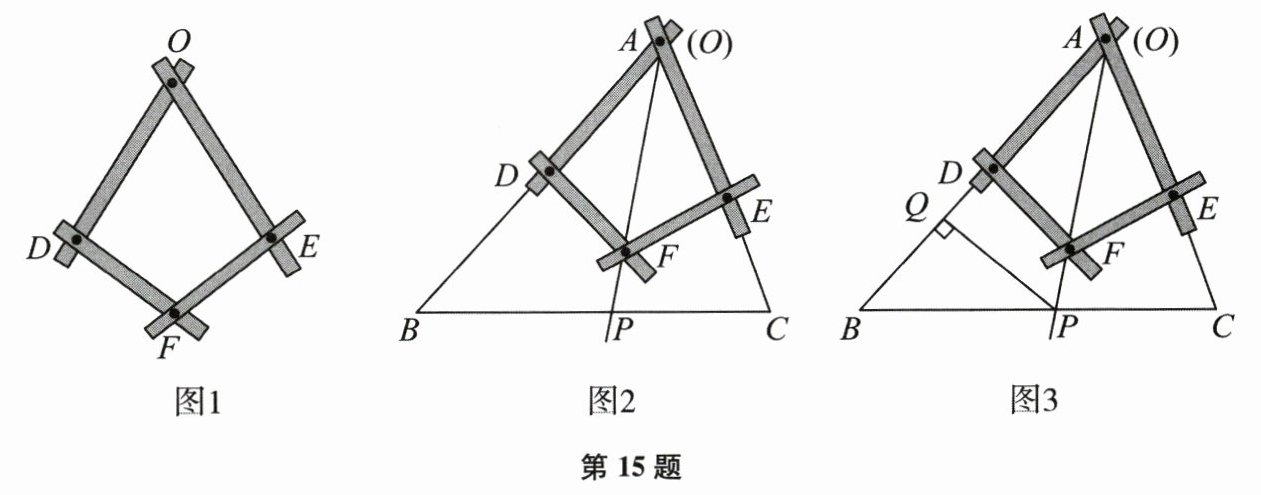 (1) 如图2,将仪器放置在 $ \triangle ABC $ 上,使点 $ O $ 与顶点 $ A $ 重合, $ D $, $ E $ 分别在边 $ AB $, $ AC $ 上,沿 $ AF $ 画一条射线 $ AP $,交 $ BC $ 于点 $ P $. $ AP $ 是 $ \angle BAC $ 的平分线吗? 请判断并说明理由;