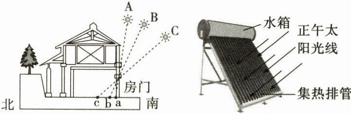 第17题,昆明位于北半球,且在北回归线以北,故安装太阳能热水器时将集热排管朝向南方有利于更好地收集热量。第18题,从图示来看,A点的太阳光线与地平面的夹角明显大于B点与C点的太阳光线与地平面的夹角,故照入室内面积最小;太阳光线与地平面的夹角越大,白昼时间越长,白天集热时间越长,故在A点时,白天的集热时间最长,而在C点时,白天的集热时间最短,集热量最低;太阳能热水器集热效果受天气的影响,例如,晴天集热效果好,阴天集热效果差。
