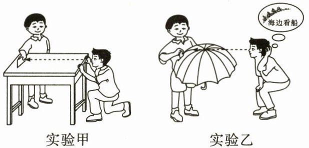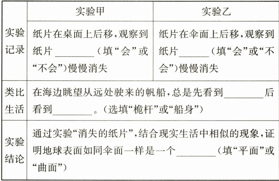 (2)题,由实验甲可知,桌面是平面,纸片在桌面上后移,观察到纸片不会慢慢消失;乙实验纸片在伞面上后移,伞面是曲面,观察到纸片会慢慢消失,通过实验“消失的纸片”,结合现实生活中相似的现象,可证明地球表面如同伞面一样是一个曲面。