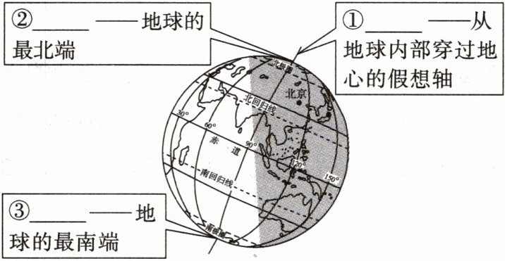 精析:第(1)题,根据所学知识可知,经线是连接南北两极并垂直于纬线的线,因此想要确定出经纬线,先要确定两个对称点作为南、北两极,而地球是一个倾斜的球体,因此确定出两极之后,用小木棍贯穿泡沫球,然后在泡沫球上绘制出若干条经线和纬线,最后将泡沫球固定在支架上。第(2)题,读图可知,地球仪上没有标注赤道长度和表面积;地球是一个两极稍扁、赤道略鼓的不规则球体,但地球仪是正球体;地球仪上有连接南北两极的经线。