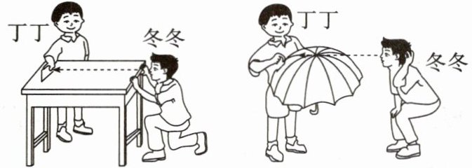 9. 下图中丁丁和冬冬在进行地理实验探究,丁丁手持的纸片沿着桌面和伞面逐渐向冬冬靠近或离开。下列选项与图示实验探究有关的是 (