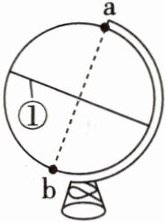 6.C 7.C 第6题,读图可知,数码①指示赤道。第7题,读图可知,铁丝(虚线)代表地轴,地轴是地球的自转轴,是从地球内部穿过地心的假想轴,其北端与地球表面的交点a是北极,南端与地球表面的交点b是南极。