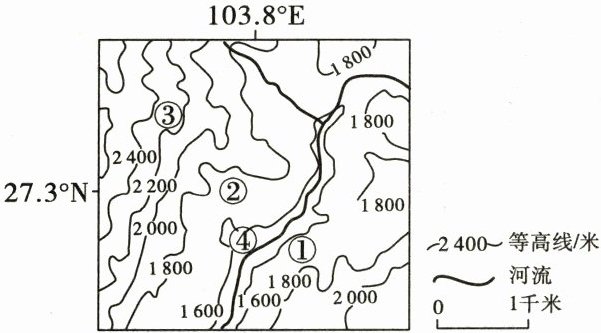 大樱桃是昭通市鲁甸县的著名物产。大樱桃适宜生长在山区向阳山坡、地面坡度小、无积水的环境中。读鲁甸县部分地区地形图,完成13~14题。