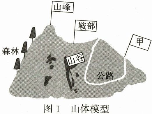 (1)题,山体部位有山脊、山谷、山峰、 鞍部和陡崖等,由图可知,图1中,同学们忘记 标注的地形部位甲是山脊。第