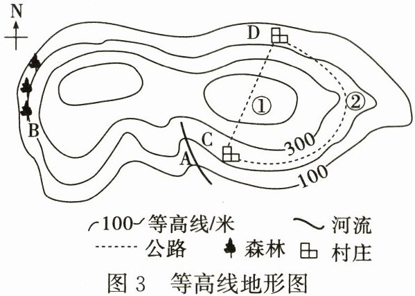 。(5)据图3分析,连接C、D两村的拟建公路线路①和线路②,坡度较缓的是