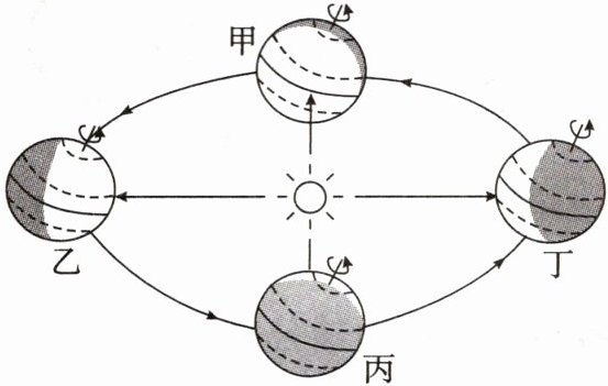 2024 年 5 月 28 日,神舟十八号乘组航天员叶光富、李聪、李广苏密切协同,在空间站机械臂和地面科研人员的配合支持下,完成了空间站空间碎片防护装置安装、舱外设备设施巡检等任务,出舱活动取得圆满成功。读地球公转示意图(甲、乙、丙、丁表示“二分二至”),完成(1)~(2)题。