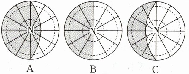 5. 图 A、图 B、图 C 都是北半球重要节气的太阳光照图,请判断图 A、图 B、图 C 分别表示什么节气,并说明判断理由。