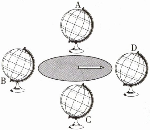 。2. 随着地球仪的移动,太阳直射点不断发生变化。当移动到图中 D 位置时,太阳光线直射在